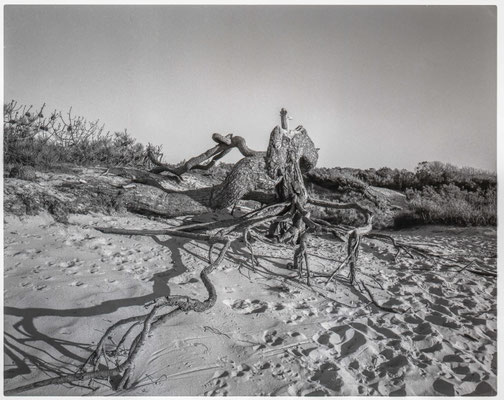 Une décennie plus tard, la photographe médocaine réitère l’expérience avec l’exposition Les 111 – 2024, produite par la Scène nationale Carré-Colonnes. Le constat est sans appel : le trait de côte a dangereusement reculé, le paysage du littoral s’est encore altéré sous l’effet de l’érosion, des pollutions, de l’urbanisation, des incendies…
